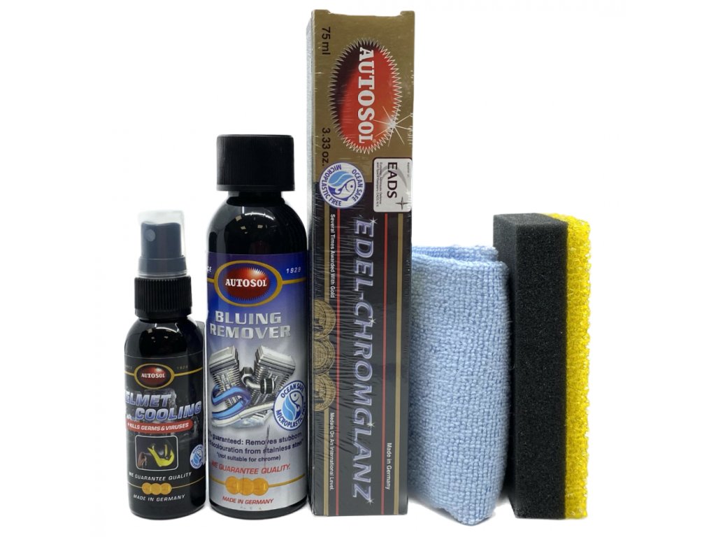 Tato pečlivě sestavená sada nabízí vše, co potřebuje každý motorkář k udržení svého stroje i helmy v perfektním stavu. Součástí je účinný čistič výfukových svodů, který odstraní zabarvení způsobené teplem (modrání, žloutnutí, hnědnutí), a také lešticí pasta na kov, která kov dokonale vyčistí, oživí a dodá mu zrcadlový lesk.